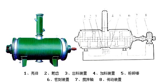 具有結構簡單,操作方便,使用周期長,性能穩定可靠,蒸汽耗量小,適用性能強,產品質量好,特別適用于不耐高溫、易燃、調溫下易氧化的膏狀物料的干燥,該機經用戶長期使用證明是一良好的干燥設備。原理:被干燥物料從殼體上方正中間加入,在不斷正反轉動的耙齒的攪拌下,物料軸向來回走動,與殼體內壁接觸的表面不斷更新,受到蒸汽的間接加熱,耙齒的均勻攪拌,粉碎棒的粉碎,使物料表面水分更有利的排出,氣化的水分經干式除塵器、濕式除塵器、冷凝器,從真空泵出口處放空。結構:真空耙式干燥機的主要部件。